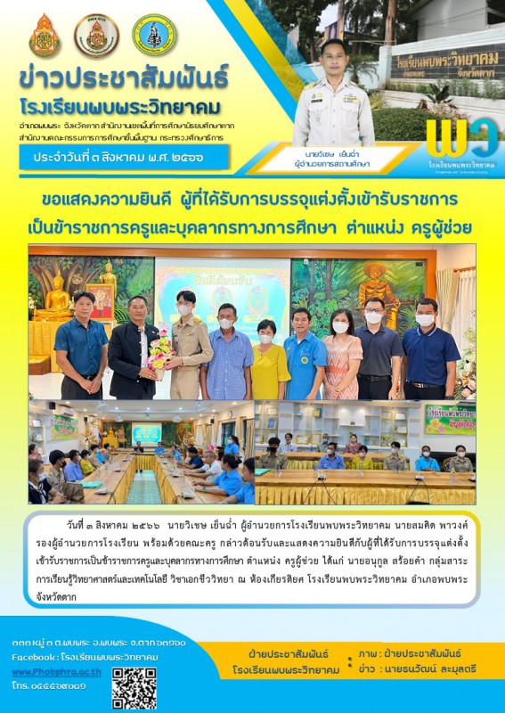 วันที่ ๓ สิงหาคม ๒๕๖๖ นายวิเชษ เย็นฉ่ำ ผู้อำนวยการโรงเรียนพบพระวิทยาคม นายสมคิด พาวงศ์ รองผู้อำนวยการโรงเรียน พร้อมด้วยคณะครู กล่าวต้อนรับและแสดงความยินดีกับผู้ที่ได้รับการบรรจุแต่งตั้งเข้ารับราชการเป็นข้าราชการครูและบุคลากรทางการศึกษา ตำแหน่ง ครูผู้ช่วย ได้แก่ นายอนุกูล สร้อยคำ กลุ่มสาระการเรียนรู้วิทยาศาสตร์และเทคโนโลยี วิชาเอกชีววิทยา ณ ห้องเกียรติยศ โรงเรียนพบพระวิทยาคม |
