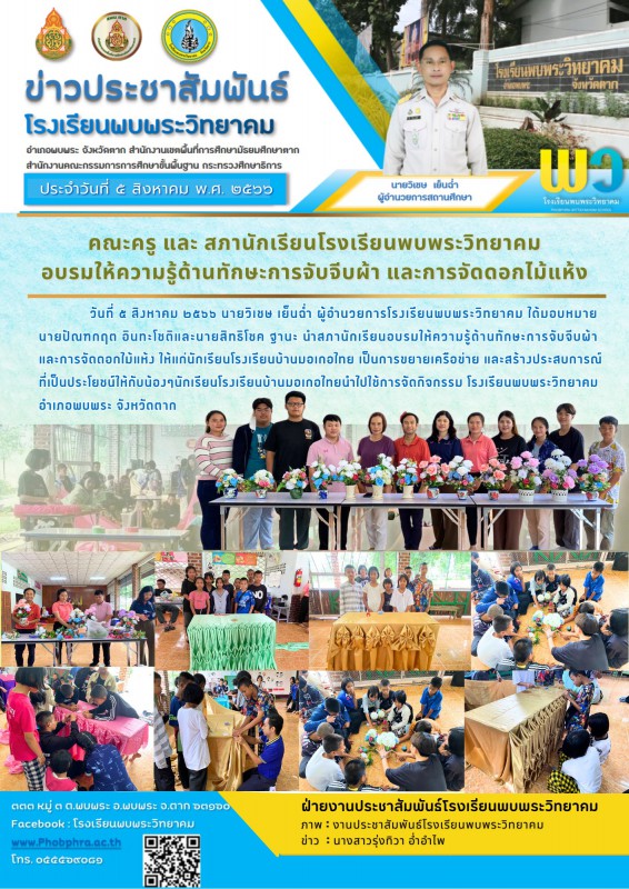 วันที่ ๕ สิงหาคม ๒๕๖๖ นายวิเชษ เย็นฉ่ำ ผู้อำนวยการโรงเรียนพบพระวิทยาคม ได้มอบหมาย นายปัณฑกฤต อินทะโชติและนายสิทธิโชค ฐานะ นำสภานักเรียนอบรมให้ความรู้ด้านทักษะการจับจีบผ้า และการจัดดอกไม้แห้ง ให้แก่นักเรียนโรงเรียนบ้านมอเกอไทย เป็นการขยายเครือข่าย และสร้างประสบการณ์ที่เป็นประโยชน์ให้กับน้องๆนักเรียนโรงเรียนบ้านมอเกอไทยนำไปใช้การจัดกิจกรรม โรงเรียนพบพระวิทยาคม |