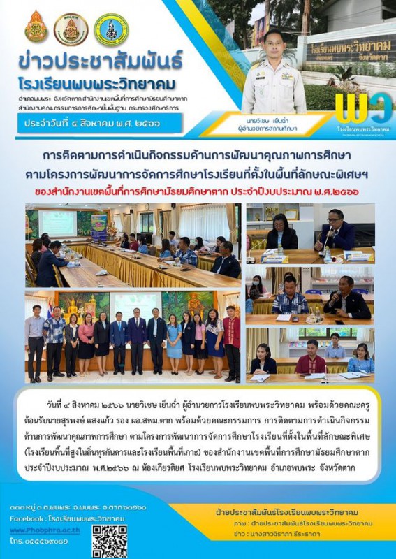 วันที่ ๔ สิงหาคม ๒๕๖๖ นายวิเชษ เย็นฉ่ำ ผู้อำนวยการโรงเรียนพบพระวิทยาคม พร้อมด้วยคณะครู ต้อนรับนายสุรพงษ์ แสงแก้ว รอง ผอ.สพม.ตาก พร้อมด้วยคณะกรรมการ การติดตามการดำเนินกิจกรรมด้านการพัฒนาคุณภาพการศึกษา ตามโครงการพัฒนาการจัดการศึกษาโรงเรียนที่ตั้งในพื้นที่ลักษณะพิเศษ (โรงเรียนพื้นที่สูงในถิ่นทุรกันดารและโรงเรียนพื้นที่เกาะ) ของสำนักงานเขตพื้นที่การศึกษามัธยมศึกษาตาก ประจำปีงบประมาณ พ.ศ.๒๕๖๖ ณ ห้องเกียรติยศ โรงเรียนพบพระวิทยาคม |