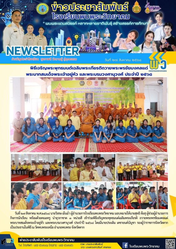 วันที่ ๒๗ สิงหาคม พ.ศ.๒๕๖๘ นายวิเชษ เย็นฉ่ำ ผู้อำนวยการโรงเรียนพบพระวิทยาคม มอบหมายให้นายสุทธิ ต๊ะสุ ผู้ช่วยผู้อำนวยการกิจการนักเรียน พร้อมด้วยคณะครู นำยุวกาชาด ๑ หน่วยสี เข้าร่วมพิธีเจริญพระพุทธมนต์เฉลิมพระเกียรติ ถวายพระพรชัยมงคลแด่พระบาทสมเด็จพระเจ้าอยู่หัว และพระบรมวงศานุวงศ์ ประจำปี ๒๕๖๘ โดยมีนายประเดิม เดชายนต์บัญชา รองผู้ว่าราชการจังหวัดตาก เป็นประธานในพิธี ณ วัดพบพระเหนือ อำเภอพบพระ จังหวัดตาก |