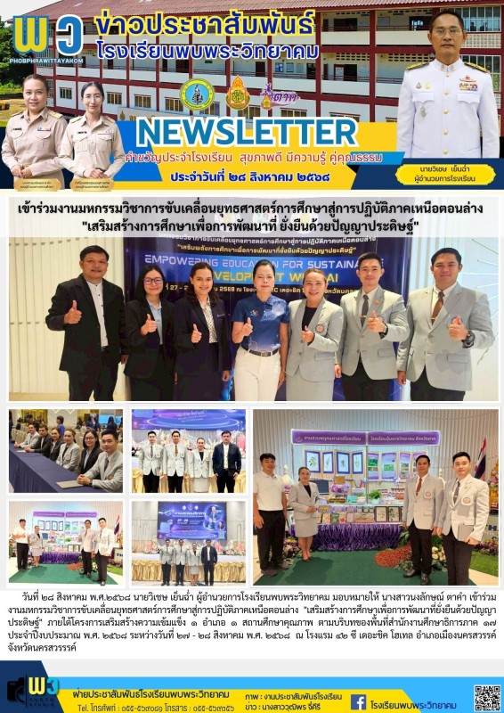 วันที่ ๒๘ สิงหาคม พ.ศ.๒๕๖๘ นายวิเชษ เย็นฉ่ำ ผู้อำนวยการโรงเรียนพบพระวิทยาคม มอบหมายให้ นางสาวนงลักษณ์ ตาคำ เข้าร่วมงานมหกรรมวิชาการขับเคลื่อนยุทธศาสตร์การศึกษาสู่การปฏิบัติภาคเหนือตอนล่าง "เสริมสร้างการศึกษาเพื่อการพัฒนาที่ยั่งยืนด้วยปัญญาประดิษฐ์" ภายใต้โครงการเสริมสร้างความเข้มแข็ง ๑ อำเภอ ๑ สถานศึกษาคุณภาพ ตามบริบทของพื้นที่สำนักงานศึกษาธิการภาค ๑๗ ประจำปีงบประมาณ พ.ศ. ๒๕๖๘ ระหว่างวันที่ ๒๗ - ๒๘ สิงหาคม พ.ศ. ๒๕๖๘ ณ โรงแรม ๔๒ ซี เดอะชิค โฮเทล อำเภอเมืองนครสวรรค์ จังหวัดนครสวรรรค์ |