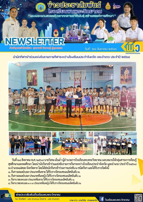 วันที่ ๒๘ สิงหาคม พ.ศ. ๒๕๖๘ นายวิเชษ เย็นฉ่ำ ผู้อำนวยการโรงเรียนพบพระวิทยาคม มอบหมายให้กลุ่มสาระการเรียนรู้สุขศึกษาและพลศึกษา โดยนำนักกีฬาเข้าร่วมเเข่งขันรายการกีฬาระหว่างโรงเรียนประจำจังหวัด และอำเภอ ประจำปี ๒๕๖๘ ณ อำเภอแม่สอด จังหวัดตาก โดยได้ส่งนักกีฬาเข้าร่วมการแข่งขัน ๒ ชนิดกีฬา เเละได้รับรางวัลดังนี้