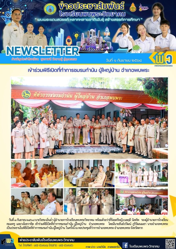 วันที่ ๑ กันยายน ๒๕๖๘ นายวิเชษ เย็นฉ่ำ ผู้อำนวยการโรงเรียนพบพระวิทยาคม พร้อมด้วยว่าที่ร้อยตรีหญิง มลฤดี นิลทัพ รองผู้อำนวยการโรงเรียน คณะครู และวงโยธวาทิต เข้าร่วมพิธีเปิดที่ทำการชมรมกำนัน ผู้ใหญ่บ้าน อำเภอพบพระ โดยมีนายธันย์ปวัฒน์ ภูริวัฒนเมธา นายอำเภอพบพระ เป็นประธานในพิธีเปิดที่ทำการชมรมกำนัน ผู้ใหญ่บ้าน ในครั้งนี้ ณ หอประชุมที่ว่าการอำเภอพบพระ อำเภอพบพระ จังหวัดตาก |