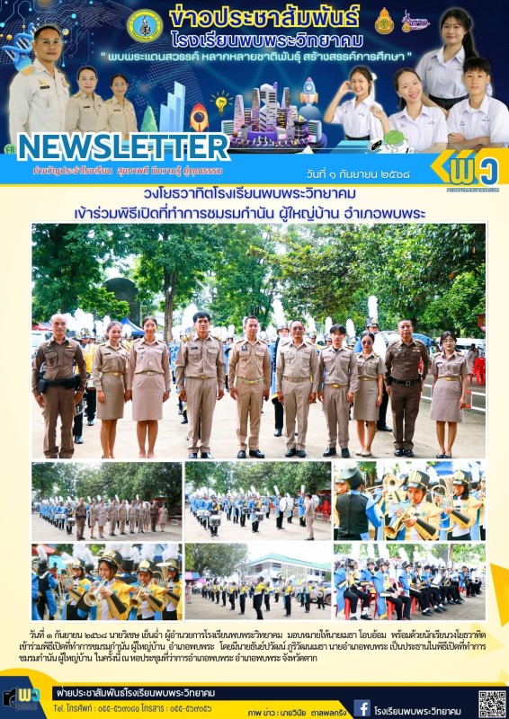 วันที่ ๑ กันยายน ๒๕๖๘ นายวิเชษ เย็นฉ่ำ ผู้อำนวยการโรงเรียนพบพระวิทยาคม มอบหมายให้นายเมธา โอบอ้อม พร้อมด้วยนักเรียนวงโยธวาทิต เข้าร่วมพิธีเปิดที่ทำการชมรมกำนัน ผู้ใหญ่บ้าน อำเภอพบพระ โดยมีนายธันย์ปวัฒน์ ภูริวัฒนเมธา นายอำเภอพบพระ เป็นประธานในพิธีเปิดที่ทำการชมรมกำนัน ผู้ใหญ่บ้าน ในครั้งนี้ ณ หอประชุมที่ว่าการอำเภอพบพระ อำเภอพบพระ จังหวัดตาก |