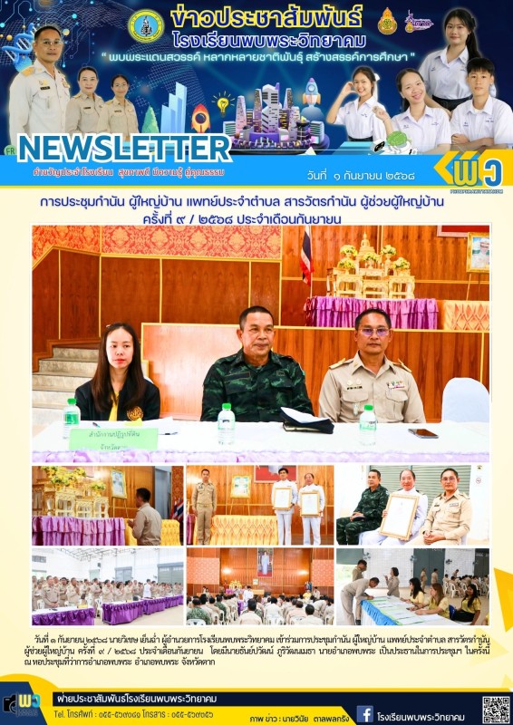 วันที่ ๑ กันยายน ๒๕๖๘ นายวิเชษ เย็นฉ่ำ ผู้อำนวยการโรงเรียนพบพระวิทยาคม เข้าร่วมการประชุมกำนัน ผู้ใหญ่บ้าน แพทย์ประจำตำบล สารวัตรกำนัน ผู้ช่วยผู้ใหญ่บ้าน ครั้งที่ ๙ / ๒๕๖๘ ประจำเดือนกันยายน โดยมีนายธันย์ปวัฒน์ ภูริวัฒนเมธา นายอำเภอพบพระ เป็นประธานในการประชุมฯ ในครั้งนี้ ณ หอประชุมที่ว่าการอำเภอพบพระ อำเภอพบพระ จังหวัดตาก |