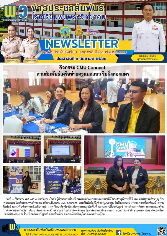 วันที่ ๑ กันยายน พ.ศ.๒๕๖๘ นายวิเชษ เย็นฉ่ำ ผู้อำนวยการโรงเรียนพบพระวิทยาคม มอบหมายให้ นางสาววุฒิพร จี๋คีรี และ นางสาวจันจิรา บุญเรือง ครูแนะแนว โรงเรียนพบพระวิทยาคม เข้าร่วมกิจกรรม CMU Connect : สานสัมพันธ์เครือข่ายครูแนะแนว ริมฝั่งสองนคร (ภาคกลาง) เพื่อเสริมสร้างความสัมพันธ์ และเครือข่ายความร่วมมือระหว่าง มหาวิทยาลัยเชียงใหม่กับครูแนะแนวในพื้นที่ และแลกเปลี่ยนข้อมูลข่าวสารด้านการศึกษา การแนะแนวด้านการศึกษาต่อแก่นักเรียน ประชาสัมพันธ์และสร้างความเข้าใจเกี่ยวกับหลักสูตร โอกาสทางการศึกษา และระบบการรับเข้าศึกษาของมหาวิทยาลัยเชียงใหม่ประจำปี ๒๕๖๙ ณ โรงเรียนเฉลิมขวัญสตรี ตำบลในเมือง อำเภอเมืองพิษณุโลก จังหวัดพิษณุโลก |