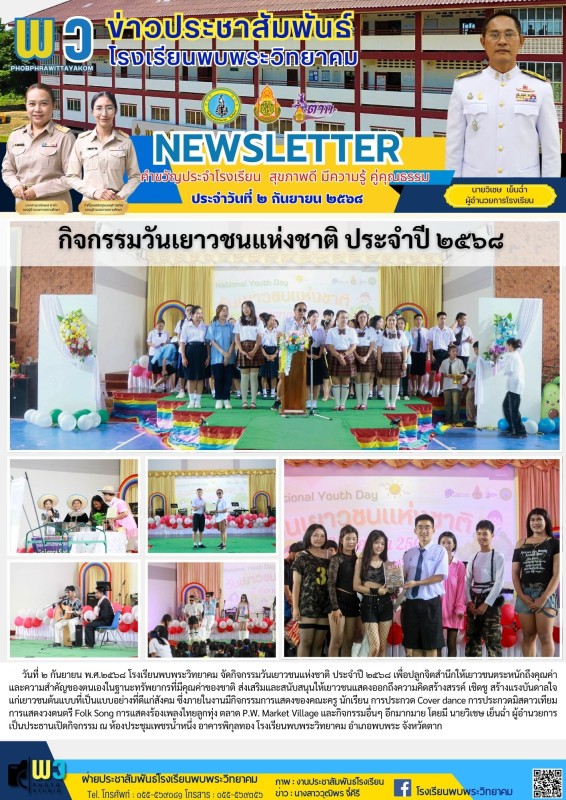 วันที่ ๒ กันยายน พ.ศ.๒๕๖๘ โรงเรียนพบพระวิทยาคม จัดกิจกรรมวันเยาวชนแห่งชาติ ประจำปี ๒๕๖๘ เพื่อปลูกจิตสำนึกให้เยาวชนตระหนักถึงคุณค่าและความสำคัญของตนเองในฐานะทรัพยากรที่มีคุณค่าของชาติ ส่งเสริมและสนับสนุนให้เยาวชนแสดงออกถึงความคิดสร้างสรรค์ เชิดชู สร้างแรงบันดาลใจ แก่เยาวชนต้นแบบที่เป็นแบบอย่างที่ดีแก่สังคม ซึ่งภายในงานมีกิจกรรมการแสดงของคณะครู นักเรียน การประกวด Cover dance การประกวดมิสดาวเทียม การแสดงวงดนตรี Folk Song การแสดงร้องเพลงไทยลูกทุ่ง ตลาด P.W. Market Village และกิจกรรมอื่นๆ อีกมากมาย โดยมี นายวิเชษ เย็นฉ่ำ ผู้อำนวยการ เป็นประธานเปิดกิจกรรม ณ ห้องประชุมเพชรน้ำหนึ่ง อาคารพิกุลทอง โรงเรียนพบพระวิทยาคม อำเภอพบพระ จังหวัดตาก |