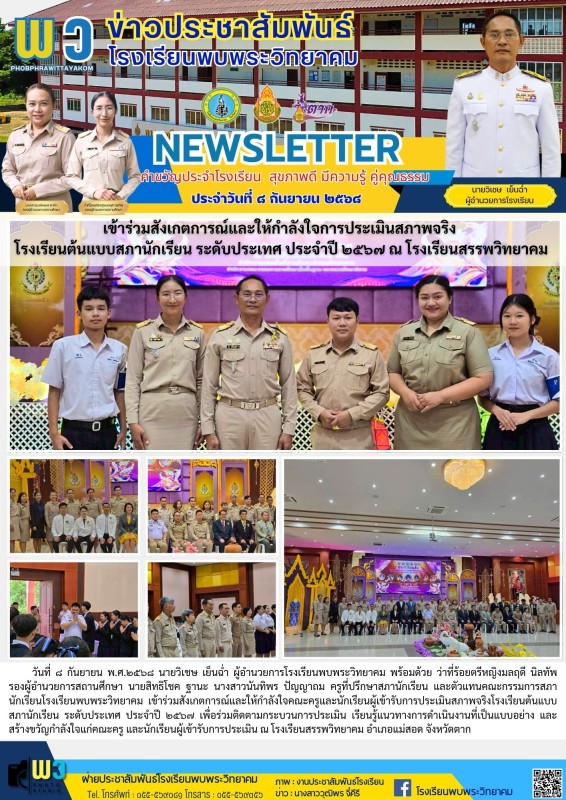วันที่ ๘ กันยายน พ.ศ.๒๕๖๘ นายวิเชษ เย็นฉ่ำ ผู้อำนวยการโรงเรียนพบพระวิทยาคม พร้อมด้วย ว่าที่ร้อยตรีหญิงมลฤดี นิลทัพ รองผู้อำนวยการสถานศึกษา นายสิทธิโชค ฐานะ นางสาวนันทิพร ปัญญาถม ครูที่ปรึกษาสภานักเรียน และตัวแทนคณะกรรมการสภานักเรียนโรงเรียนพบพระวิทยาคม เข้าร่วมสังเกตการณ์และให้กำลังใจคณะครูและนักเรียนผู้เข้ารับการประเมินสภาพจริงโรงเรียนต้นแบบสภานักเรียน ระดับประเทศ ประจำปี ๒๕๖๗ เพื่อร่วมติดตามกระบวนการประเมิน เรียนรู้แนวทางการดำเนินงานที่เป็นแบบอย่าง และสร้างขวัญกำลังใจแก่คณะครู และนักเรียนผู้เข้ารับการประเมิน ณ โรงเรียนสรรพวิทยาคม อำเภอแม่สอด จังหวัดตาก |