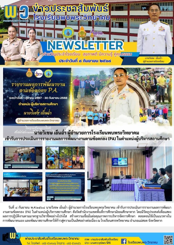 วันที่ ๘ กันยายน พ.ศ.๒๕๖๘ นายวิเชษ เย็นฉ่ำ ผู้อำนวยการโรงเรียนพบพระวิทยาคม เข้ารับการประเมินการรายงานผลการพัฒนางานตามข้อตกลง (PA) ในตำแหน่งผู้บริหารสถานศึกษา สังกัดสำนักงานเขตพื้นที่การศึกษามัธยมศึกษาตาก โดยมีวัตถุประสงค์เพื่อแสดงผลการปฏิบัติงานตามมาตรฐานวิชาชีพอย่างโปร่งใส สร้างความเชื่อมั่นต่อคุณภาพการบริหารจัดการศึกษา ตลอดจนใช้เป็นแนวทางในการพัฒนาตนเอง และพัฒนาสถานศึกษาให้ก้าวสู่ความเป็นเลิศอย่างต่อเนื่อง ณ โรงเรียนสรรพวิทยาคม อำเภอแม่สอด จังหวัดตาก |
