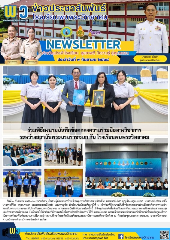 วันที่ ๙ กันยายน พ.ศ.๒๕๖๘ นายวิเชษ เย็นฉ่ำ ผู้อำนวยการโรงเรียนพบพระวิทยาคม พร้อมด้วย นางสาวจันจิรา บุญเรือง ครูแนะแนว นางสาวนันทิชา แซ่ยั้ง นางสาวสิรีธร อรุณบรรพต และนางสาวหนึ่งฤทัย แสนหาญชัย นักเรียนชั้นมัธยมศึกษาปีที่ ๖ เข้าร่วมพิธีลงนามบันทึกข้อตกลงความร่วมมือทางวิชาการระหว่างสถาบันพระบรมราชชนกกับโรงเรียนพบพระวิทยาคม การลงนามบันทึกข้อตกลงในครั้งนี้ มีวัตถุประสงค์เพื่อส่งเสริมและพัฒนาคุณภาพการศึกษาด้านสาธารณสุขและวิทยาศาสตร์สุขภาพ เปิดโอกาสให้นักเรียนที่มีความสนใจในสายวิชาชีพดังกล่าว ได้รับการแนะแนว การเตรียมความพร้อมก่อนเข้าศึกษาต่อในระดับอุดมศึกษา เป็นการสร้างเครือข่ายความร่วมมือระหว่างสถานศึกษาในระดับมัธยมศึกษาและสถาบันการอุดมศึกษาอีกด้วย ณ ห้องประชุมนครสรลวงสองแคว อาคารบึงราชนก ตำบลวังทอง อำเภอวังทอง จังหวัดพิษณุโลก |