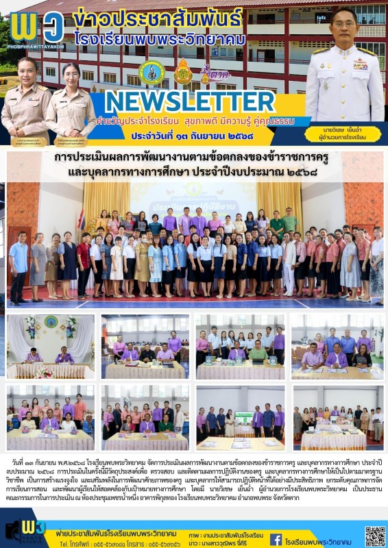 วันที่ ๑๓ กันยายน พ.ศ.๒๕๖๘ โรงเรียนพบพระวิทยาคม จัดการประเมินผลการพัฒนางานตามข้อตกลงของข้าราชการครู และบุคลากรทางการศึกษา ประจำปี งบประมาณ ๒๕๖๘ การประเมินในครั้งนี้มีวัตถุประสงค์เพื่อ ตรวจสอบ และติดตามผลการปฏิบัติงานของครู และบุคลากรทางการศึกษาให้เป็นไปตามมาตรฐานวิชาชีพ เป็นการสร้างแรงจูงใจ และเสริมพลังในการพัฒนาศักยภาพของครู และบุคลากรให้สามารถปฏิบัติหน้าที่ได้อย่างมีประสิทธิภาพ ยกระดับคุณภาพการจัด การเรียนการสอน และพัฒนาผู้เรียนให้สอดคล้องกับเป้าหมายทางการศึกษา โดยมี นายวิเชษ เย็นฉ่ำ ผู้อำนวยการโรงเรียนพบพระวิทยาคม เป็นประธานคณะกรรมการในการประเมิน ณ ห้องประชุมเพชรน้ำหนึ่ง อาคารพิกุลทอง โรงเรียนพบพระวิทยาคม อำเภอพบพระ จังหวัดตาก |
