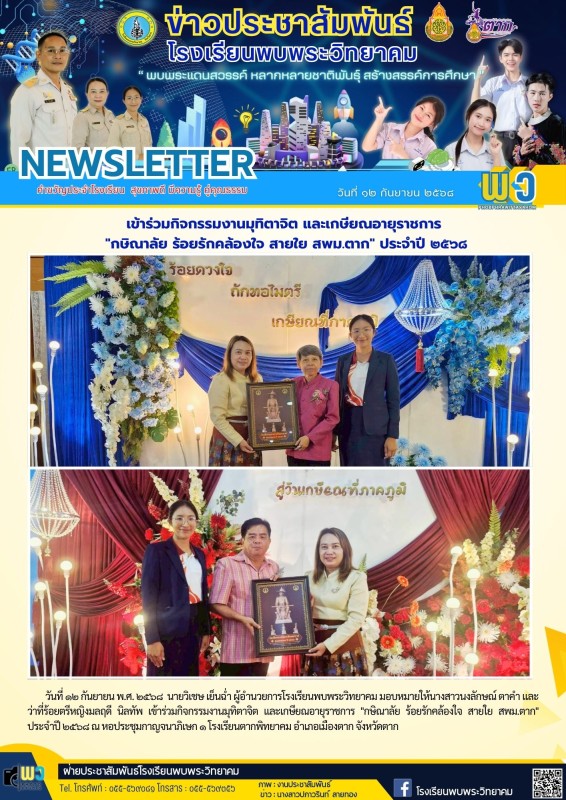 วันที่ ๑๒ กันยายน พ.ศ. ๒๕๖๘ นายวิเชษ เย็นฉ่ำ ผู้อำนวยการโรงเรียนพบพระวิทยาคม มอบหมายให้นางสาวนงลักษณ์ ตาคำ และว่าที่ร้อยตรีหญิงมลฤดี นิลทัพ เข้าร่วมกิจกรรมงานมุทิตาจิต และเกษียณอายุราชการ "กษิณาลัย ร้อยรักคล้องใจ สายใย สพม.ตาก" ประจำปี ๒๕๖๘ ณ หอประชุมกาญจนาภิเษก ๑ โรงเรียนตากพิทยาคม อำเภอเมืองตาก จังหวัดตาก |