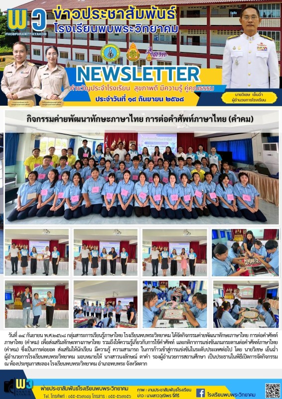 วันที่ ๑๔ กันยายน พ.ศ.๒๕๖๘ กลุ่มสาระการเรียนรู้ภาษาไทย โรงเรียนพบพระวิทยาคม ได้จัดกิจกรรมค่ายพัฒนาทักษะภาษาไทย การต่อคำศัพท์ภาษาไทย (คำคม) เพื่อส่งเสริมทักษะทางภาษาไทย รวมถึงให้ความรู้เกี่ยวกับการใช้คำศัพท์ และกติกาการแข่งขันเกมกระดานต่อคำศัพท์ภาษาไทย (คำคม) ซึ่งเป็นการต่อยอด ส่งเสริมให้นักเรียน มีความรู้ ความสามารถ ในการก้าวเข้าสู่การแข่งขันในระดับประเทศต่อไป โดย นายวิเชษ เย็นฉ่ำ ผู้อำนวยการโรงเรียนพบพระวิทยาคม มอบหมายให้ นางสาวนงลักษณ์ ตาคำ รองผู้อำนวยการสถานศึกษา เป็นประธานในพิธีเปิดการจัดกิจกรรม ณ ห้องประชุมกาสะลอง โรงเรียนพบพระวิทยาคม อำเภอพบพระ จังหวัดตาก |