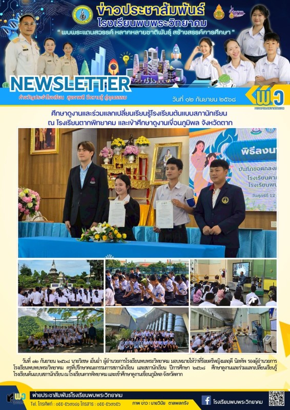 วันที่ ๑๒ กันยายน ๒๕๖๘ นายวิเชษ เย็นฉ่ำ ผู้อำนวยการโรงเรียนพบพระวิทยาคม มอบหมายให้ว่าที่ร้อยตรีหญิงมลฤดี นิลทัพ รองผู้อำนวยการโรงเรียนพบพบพระวิทยาคม ครูที่ปรึกษาคณะกรรมการสภานักเรียน และสภานักเรียน ปีการศึกษา ๒๕๖๘ ศึกษาดูงานและร่วมแลกเปลี่ยนเรียนรู้โรงเรียนต้นแบบสภานักเรียน ณ โรงเรียนตากพิทยาคม และเข้าศึกษาดูงานเขื่อนภูมิพล จังหวัดตาก |