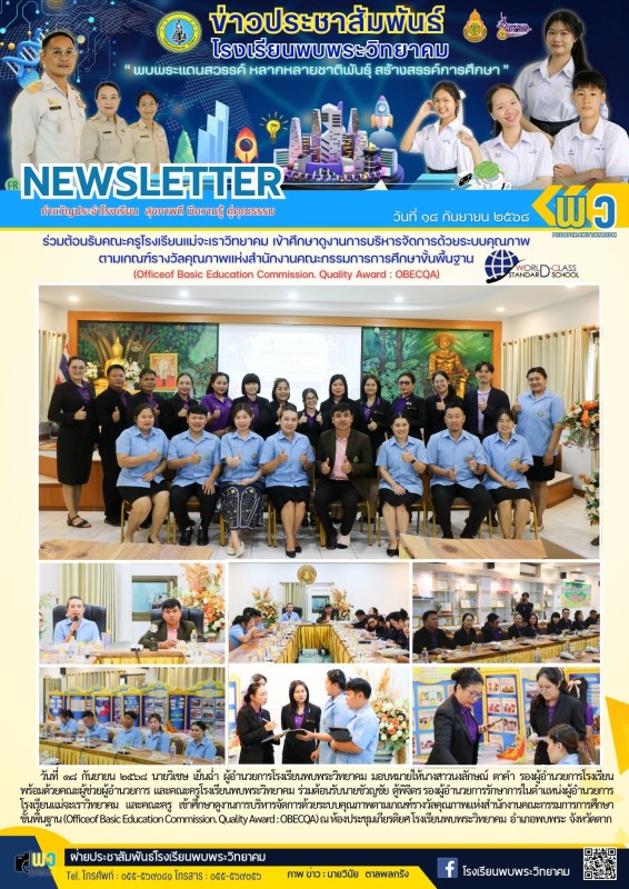 วันที่ ๑๘ กันยายน ๒๕๖๘ นายวิเชษ เย็นฉ่ำ ผู้อำนวยการโรงเรียนพบพระวิทยาคม มอบหมายให้นางสาวนงลักษณ์ ตาคำ รองผู้อำนวยการโรงเรียน พร้อมด้วยคณะผู้ช่วยผู้อำนวยการ และคณะครูโรงเรียนพบพระวิทยาคม ร่วมต้อนรับนายขัวญชัย ตู้พิจิตร รองผู้อำนวยการรักษาการในตำแหน่งผู้อำนวยการโรงเรียนแม่จะเราวิทยาคม และคณะครู เข้าศึกษาดูงานการบริหารจัดการด้วยระบบคุณภาพตามเกณฑ์รางวัลคุณภาพแห่งสำนักงานคณะกรรมการการศึกษาขั้นพื้นฐาน (Officeof Basic Education Commission. Quality Award : OBECQA) ณ ห้องประชุมเกียรติยศ โรงเรียนพบพระวิทยาคม อำเภอพบพระ จังหวัดตาก |