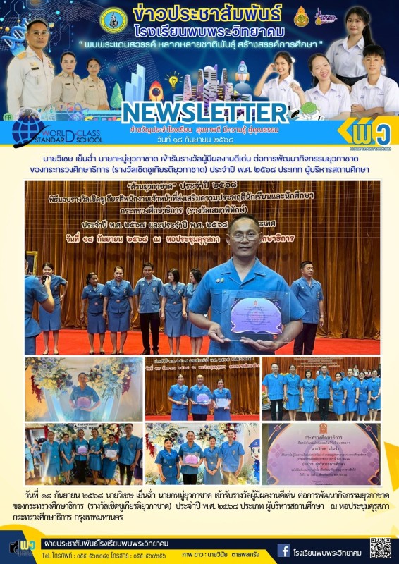 วันที่ ๑๘ กันยายน ๒๕๖๘ นายวิเชษ เย็นฉ่ำ นายกหมู่ยุวกาชาด เข้ารับรางวัลผู้มีผลงานดีเด่น ต่อการพัฒนากิจกรรมยุวกาชาด ของกระทรวงศึกษาธิการ (รางวัลเชิดชูเกียรติยุวกาชาด) ประจำปี พ.ศ. ๒๕๖๘ ประเภท ผู้บริหารสถานศึกษา ณ หอประชุมคุรุสภา กระทรวงศึกษาธิการ กรุงเทพมหานคร |