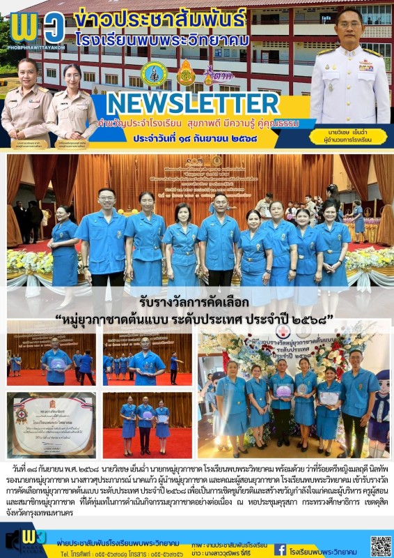 วันที่ ๑๘ กันยายน พ.ศ. ๒๕๖๘ นายวิเชษ เย็นฉ่ำ นายกหมู่ยุวกาชาด โรงเรียนพบพระวิทยาคม พร้อมด้วย ว่าที่ร้อยตรีหญิงมลฤดี นิลทัพ รองนายกหมู่ยุวกาชาด นางสาวศุประภาภรณ์ นาคแก้ว ผู้นำหมู่ยุวกาชาด และคณะผู้สอนยุวกาชาด โรงเรียนพบพระวิทยาคม เข้ารับรางวัลการคัดเลือกหมู่ยุวกาชาดต้นแบบ ระดับประเทศ ประจำปี ๒๕๖๘ เพื่อเป็นการเชิดชูเกียรติและสร้างขวัญกำลังใจแก่คณะผู้บริหาร ครูผู้สอน และสมาชิกหมู่ยุวกาชาด ที่ได้ทุ่มเทในการดำเนินกิจกรรมยุวกาชาดอย่างต่อเนื่อง ณ หอประชุมคุรุสภา กระทรวงศึกษาธิการ เขตดุสิต จังหวัดกรุงเทพมหานคร |