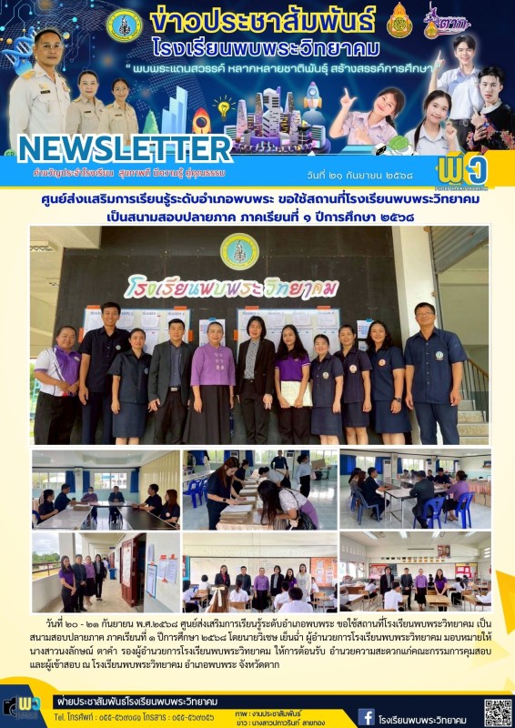 วันที่ ๒๐ - ๒๑ กันยายน พ.ศ.๒๕๖๘ ศูนย์ส่งเสริมการเรียนรู้ระดับอำเภอพบพระ ขอใช้สถานที่โรงเรียนพบพระวิทยาคม เป็นสนามสอบปลายภาค ภาคเรียนที่ ๑ ปีการศึกษา ๒๕๖๘ โดยนายวิเชษ เย็นฉ่ำ ผู้อำนวยการโรงเรียนพบพระวิทยาคม มอบหมายให้นางสาวนงลักษณ์ ตาคำ รองผู้อำนวยการโรงเรียนพบพระวิทยาคม ให้การต้อนรับ อำนวยความสะดวกแก่คณะกรรมการคุมสอบ และผู้เข้าสอบ ณ โรงเรียนพบพระวิทยาคม อำเภอพบพระ จังหวัดตาก |