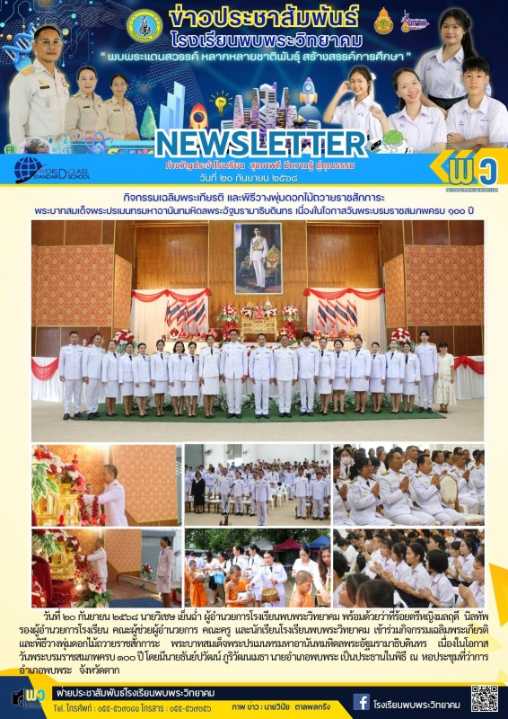 วันที่ ๒๐ กันยายน ๒๕๖๘ นายวิเชษ เย็นฉ่ำ ผู้อำนวยการโรงเรียนพบพระวิทยาคม พร้อมด้วยว่าที่ร้อยตรีหญิงมลฤดี นิลทัพ รองผู้อำนวยการโรงเรียน คณะผู้ช่วยผู้อำนวยการ คณะครู และนักเรียนโรงเรียนพบพระวิทยาคม เข้าร่วมกิจกรรมเฉลิมพระเกียรติ และพิธีวางพุ่มดอกไม้ถวายราชสักการะ พระบาทสมเด็จพระปรเมนทรมหาอานันทมหิดลพระอัฐมรามาธิบดินทร เนื่องในโอกาสวันพระบรมราชสมภพครบ ๑๐๐ ปี โดยมีนายธันย์ปวัฒน์ ภูริวัฒนเมธา นายอำเภอพบพระ เป็นประธานในพิธี ณ หอประชุมที่ว่าการอำเภอพบพระ จังหวัดตาก |