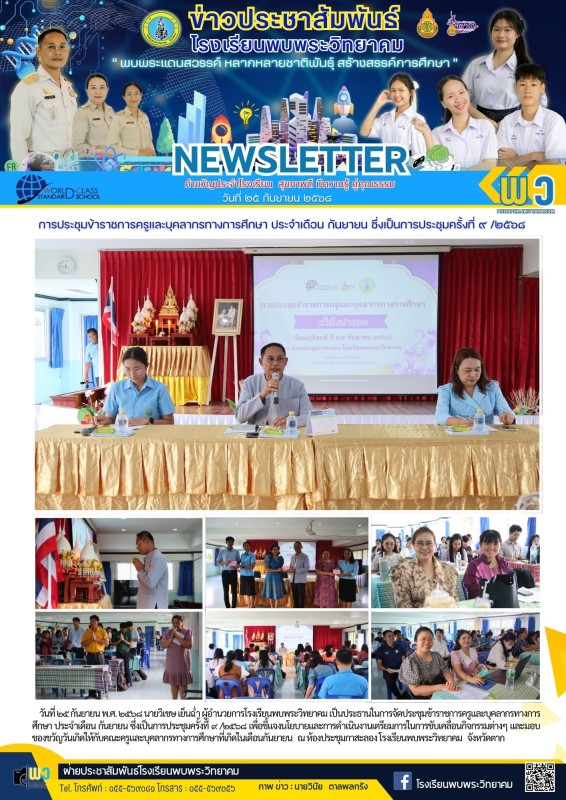 วันที่ ๒๕ กันยายน พ.ศ. ๒๕๖๘ นายวิเชษ เย็นฉ่ำ ผู้อำนวยการโรงเรียนพบพระวิทยาคม เป็นประธานในการจัดประชุมข้าราชการครูและบุคลากรทางการศึกษา ประจำเดือน กันยายน ซึ่งเป็นการประชุมครั้งที่ ๙ /๒๕๖๘ เพื่อชี้แจงนโยบายและการดำเนินงานเตรียมการในการขับเคลื่อนกิจกรรมต่างๆ และมอบของขวัญวันเกิดให้กับคณะครูและบุคลากรทางการศึกษาที่เกิดในเดือนกันยายน ณ ห้องประชุมกาสะลอง โรงเรียนพบพระวิทยาคม จังหวัดตาก |