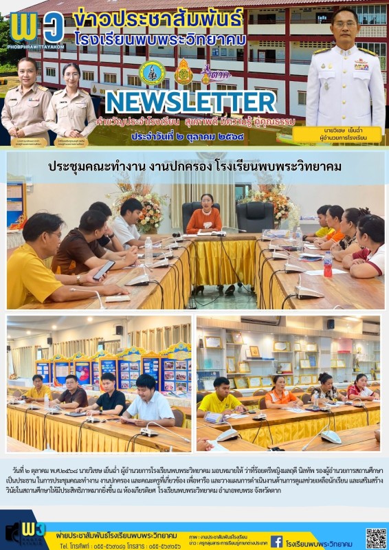 วันที่ ๒ ตุลาคม พ.ศ.๒๕๖๘ นายวิเชษ เย็นฉ่ำ ผู้อำนวยการโรงเรียนพบพระวิทยาคม มอบหมายให้ ว่าที่ร้อยตรีหญิงมลฤดี นิลทัพ รองผู้อำนวยการสถานศึกษา เป็นประธาน ในการประชุมคณะทำงาน งานปกครอง และคณะครูที่เกี่ยวข้อง เพื่อหารือ และวางแผนการดำเนินงานด้านการดูแลช่วยเหลือนักเรียน และเสริมสร้างวินัยในสถานศึกษาให้มีประสิทธิภาพมากยิ่งขึ้น ณ ห้องเกียรติยศ โรงเรียนพบพระวิทยาคม อำเภอพบพระ จังหวัดตาก |
