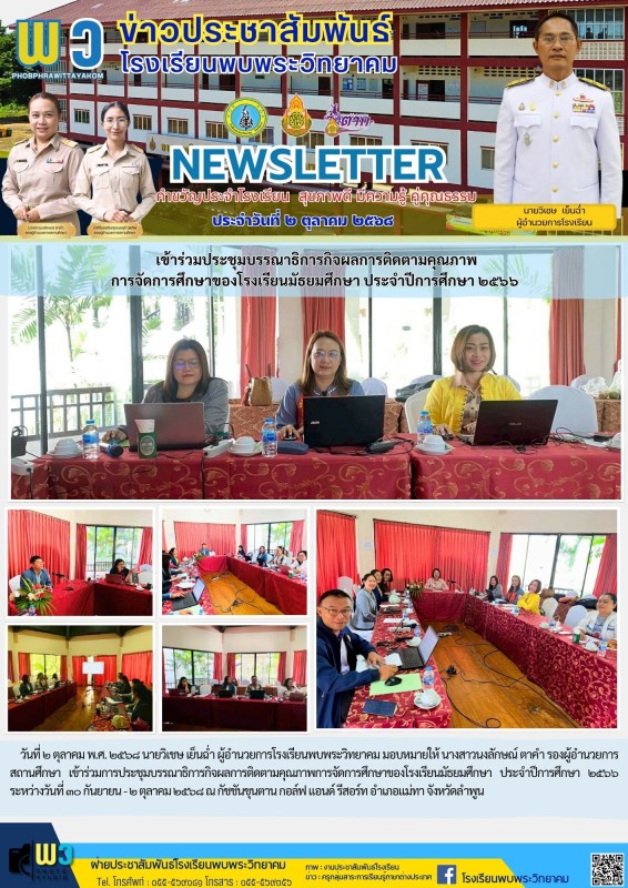 วันที่ ๒ ตุลาคม พ.ศ. ๒๕๖๘ นายวิเชษ เย็นฉ่ำ ผู้อำนวยการโรงเรียนพบพระวิทยาคม มอบหมายให้ นางสาวนงลักษณ์ ตาคำ รองผู้อำนวยการสถานศึกษา เข้าร่วมการประชุมบรรณาธิการกิจผลการติดตามคุณภาพการจัดการศึกษาของโรงเรียนมัธยมศึกษา ประจำปีการศึกษา ๒๕๖๖ ระหว่างวันที่ ๓๐ กันยายน - ๒ ตุลาคม ๒๕๖๘ ณ กัชชันขุนตาน กอล์ฟ แอนด์ รีสอร์ท อำเภอแม่ทา จังหวัดลำพูน |