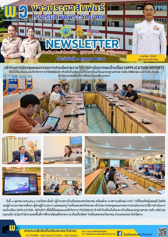 วันที่ ๓ ตุลาคม พ.ศ.๒๕๖๘ นายวิเชษ เย็นฉ่ำ ผู้อำนวยการโรงเรียนพบพระวิทยาคม พร้อมด้วย นางสาวนงลักษณ์ ตาคำ ว่าที่ร้อยตรีหญิงมลฤดี นิลทัพ รองผู้อำนวยการสถานศึกษา ผู้ช่วยผู้อำนวยการ และคณะครู โรงเรียนพบพระวิทยาคม เข้าร่วมการประชุมคณะกรรมการประเมินรายงานวิธีการดำเนินการของโรงเรียน (APPLICATION REPORT) เพื่อให้ข้อเสนอแนะเชิงวิชาการ (FEEDBACK) สำหรับโรงเรียนในโครงการโรงเรียนมาตรฐานสากล ระดับ OBECQA และระดับ SCQA สำนักงานเขตพื้นที่การศึกษามัธยมศึกษาตาก ณ ห้องเกียรติยศ โรงเรียนพบพระวิทยาคม อำเภอพบพระ จังหวัดตาก |