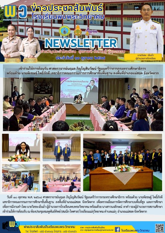 วันที่ ๑๐ ตุลาคม พ.ศ. ๒๕๖๘ ศาสตราจารย์นฤมล ภิญโญสินวัฒน์ รัฐมนตรีว่าการกระทรวงศึกษาธิการ พร้อมด้วย นายพิเชษฐ์ โพธิ์ภักดี เลขาธิการคณะกรรมการการศึกษาขั้นพื้นฐาน ลงพื้นที่อำเภอแม่สอด จังหวัดตาก เพื่อตรวจเยี่ยมการจัดการศึกษาบนพื้นที่สูง และการศึกษาเพื่อการมีงานทำ โดย นายวิเชษ เย็นฉ่ำ ผู้อำนวยการโรงเรียนพบพระวิทยาคม พร้อมด้วย นางสาวนงลักษณ์ ตาคำ รองผู้อำนวยการสถานศึกษา เข้าร่วมให้การต้อนรับ ณ ห้องประชุมชมพูพันธ์ทิพย์ (สมนึก-ไพศาล) โรงเรียนแม่กุวิทยาคม ตำบลแม่กุ อำเภอแม่สอด จังหวัดตาก |