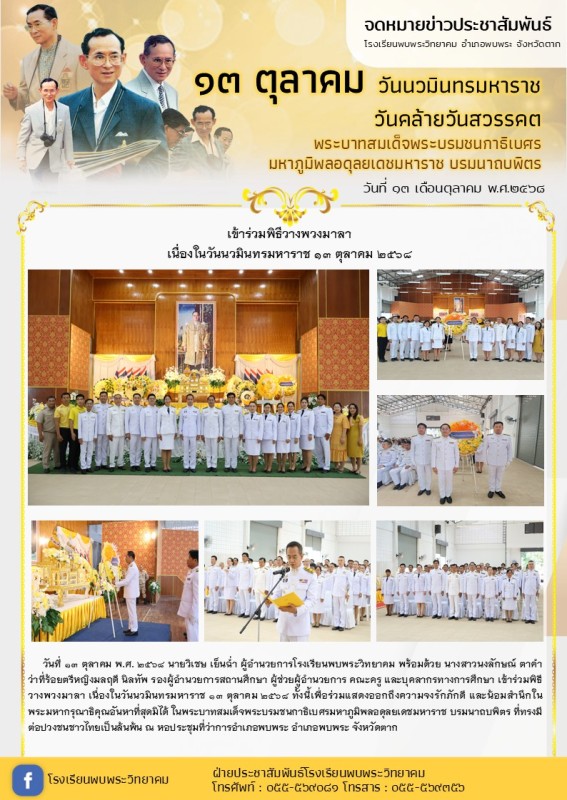วันที่ ๑๓ ตุลาคม พ.ศ. ๒๕๖๘ นายวิเชษ เย็นฉ่ำ ผู้อำนวยการโรงเรียนพบพระวิทยาคม พร้อมด้วย นางสาวนงลักษณ์ ตาคำ ว่าที่ร้อยตรีหญิงมลฤดี นิลทัพ รองผู้อำนวยการสถานศึกษา ผู้ช่วยผู้อำนวยการ คณะครู และบุคลากรทางการศึกษา เข้าร่วมพิธีวางพวงมาลา เนื่องในวันนวมินทรมหาราช ๑๓ ตุลาคม ๒๕๖๘ ทั้งนี้เพื่อร่วมแสดงออกถึงความจงรักภักดี และน้อมสำนึกใน พระมหากรุณาธิคุณอันหาที่สุดมิได้ ในพระบาทสมเด็จพระบรมชนกาธิเบศรมหาภูมิพลอดุลยเดชมหาราช บรมนาถบพิตร ที่ทรงมีต่อปวงชนชาวไทยเป็นล้นพ้น ณ หอประชุมที่ว่าการอำเภอพบพระ อำเภอพบพระ จังหวัดตาก |
