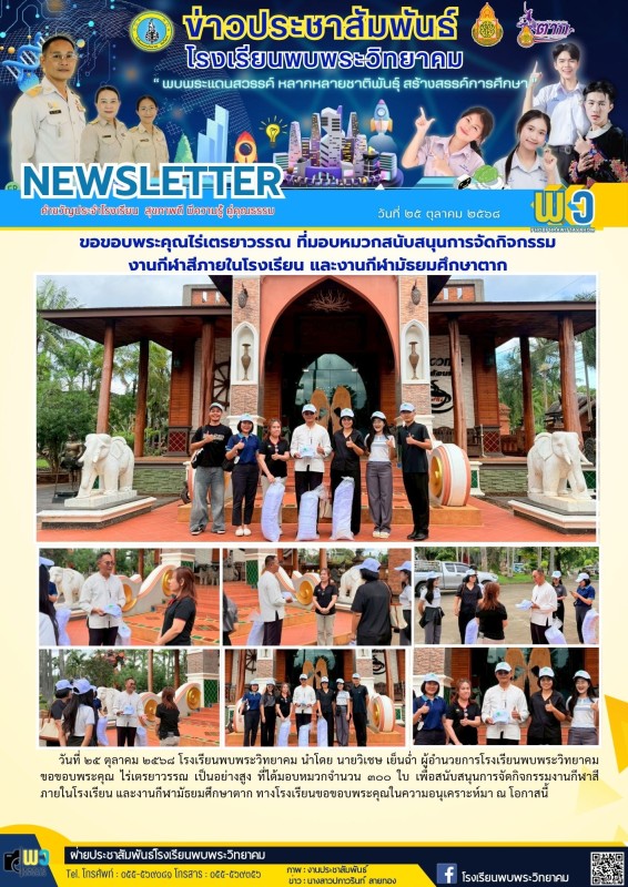 วันที่ ๒๕ ตุลาคม ๒๕๖๘ โรงเรียนพบพระวิทยาคม นำโดย นายวิเชษ เย็นฉ่ำ ผู้อำนวยการโรงเรียนพบพระวิทยาคม ขอขอบพระคุณ ไร่เตรยาวรรณ เป็นอย่างสูง ที่ได้มอบหมวกจำนวน ๓๐๐ ใบ เพื่อสนับสนุนการจัดกิจกรรมงานกีฬาสีภายในโรงเรียน และงานกีฬามัธยมศึกษาตาก ทางโรงเรียนขอขอบพระคุณในความอนุเคราะห์มา ณ โอกาสนี้ |