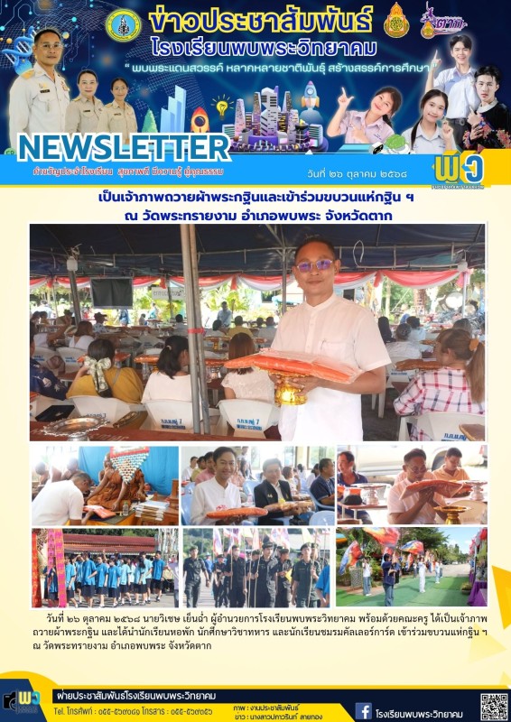 วันที่ ๒๖ ตุลาคม ๒๕๖๘ นายวิเชษ เย็นฉ่ำ ผู้อำนวยการโรงเรียนพบพระวิทยาคม พร้อมด้วยคณะครู ได้เป็นเจ้าภาพถวายผ้าพระกฐิน และได้นำนักเรียนหอพัก นักศึกษาวิชาทหาร และนักเรียนชมรมคัลเลอร์การ์ด เข้าร่วมขบวนแห่กฐิน ฯ ณ วัดพระทรายงาม อำเภอพบพระ จังหวัดตาก |