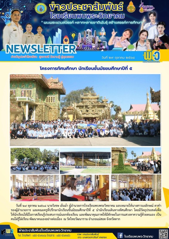 วันที่ ๒๙ ตุลาคม ๒๕๖๘ นายวิเชษ เย็นฉ่ำ ผู้อำนวยการโรงเรียนพบพระวิทยาคม มอบหมายให้นางสาวนงลักษณ์ ตาคำ รองผู้อำนวยการ และคณะครูที่ปรึกษานักเรียนชั้นมัธยมศึกษาปีที่ ๕ นำนักเรียนเดินทางทัศนศึกษา โดยมีวัตถุประสงค์เพื่อ ให้นักเรียนได้มีโอกาสเรียนรู้ประสบการณ์นอกห้องเรียน และพัฒนาคุณภาพให้มีทักษะในการแสวงหาความรู้ด้วยตนเอง เป็นคนใฝ่รู้ใฝ่เรียน พัฒนาตนเองอย่างต่อเนื่อง ณ วัดไทยวัฒนาราม อำเภอแม่สอด จังหวัดตาก |
