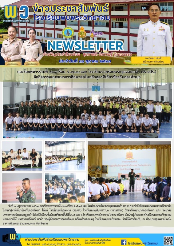 วันที่ ๓๐ ตุลาคม พ.ศ. ๒๕๖๘ กองร้อยทหารราบที่ ๔๒๓ (ร้อย .ร.๔๒๓) และ โรงเรียนนายร้อยพระจุลจอมเกล้า (รร.จปร.) เข้าจัดกิจกรรมแนะแนวการศึกษาต่อ ในหลักสูตรที่เกี่ยวข้องกับกองทัพบก ได้แก่ โรงเรียนเตรียมทหาร (รร.ตท.) โรงเรียนนายสิบทหารบก (รร.นส.ทบ.) วิทยาลัยพยาบาลกองทัพบก และ วิทยาลัยแพทยศาสตร์พระมงกุฎเกล้า ให้แก่นักเรียนชั้นมัธยมศึกษาชั้นปีที่ ๓, ๕ และ ๖ โรงเรียนพบพระวิทยาคม โดย นายวิเชษ เย็นฉ่ำ ผู้อำนวยการโรงเรียนพบพระวิทยาคม มอบหมายให้ นางสาวนงลักษณ์ ตาคำ รองผู้อำนวยการสถานศึกษา พร้อมด้วยคณะครู โรงเรียนพบพระวิทยาคม ร่วมให้การต้อนรับ ณ ห้องประชุมเพชรน้ำหนึ่ง อาคารพิกุลทอง อำเภอพบพระ จังหวัดตาก |
