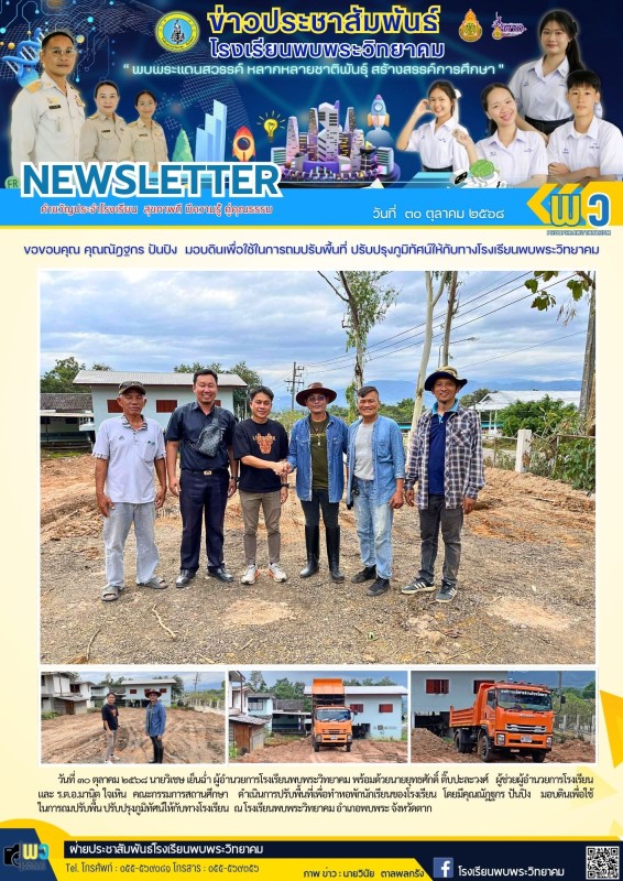 วันที่ ๓๐ ตุลาคม ๒๕๖๘ นายวิเชษ เย็นฉ่ำ ผู้อำนวยการโรงเรียนพบพระวิทยาคม พร้อมด้วยนายยุทธศักดิ์ ติ๊บปะละวงศ์ ผู้ช่วยผู้อำนวยการโรงเรียนและ ร.ต.อ.มานิต ใจเหิน คณะกรรมการสถานศึกษา ดำเนินการปรับพื้นที่เพื่อทำหอพักนักเรียนของโรงเรียน โดยมีคุณณัฎฐกร ปันปิง มอบดินเพื่อใช้ในการถมปรับพื้น ปรับปรุงภูมิทัศน์ให้กับทางโรงเรียน ณ โรงเรียนพบพระวิทยาคม อำเภอพบพระ จังหวัดตาก |