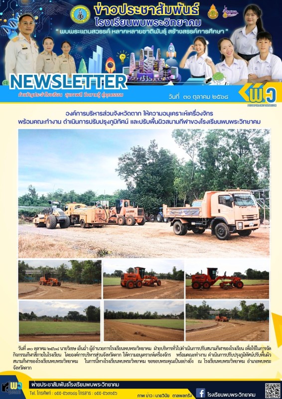 วันที่ ๓๐ ตุลาคม ๒๕๖๘ นายวิเชษ เย็นฉ่ำ ผู้อำนวยการโรงเรียนพบพระวิทยาคม ฝ่ายบริหารทั่วไปดำเนินการปรับสนามกีฬาของโรงเรียน เพื่อใช้ในการจัดกิจกรรมกีฬาสีภายในโรงเรียน โดยองค์การบริหารส่วนจังหวัดตาก ให้ความอนุเคราะห์เครื่องจักร พร้อมคณะทำงาน ดำเนินการปรับปรุงภูมิทัศน์ปรับพื้นผิวสนามกีฬาของโรงเรียนพบพระวิทยาคม ในการนี้ทางโรงเรียนพบพระวิทยาคม ขอขอบพระคุณเป็นอย่างยิ่ง ณ โรงเรียนพบพระวิทยาคม อำเภอพบพระ จังหวัดตาก |