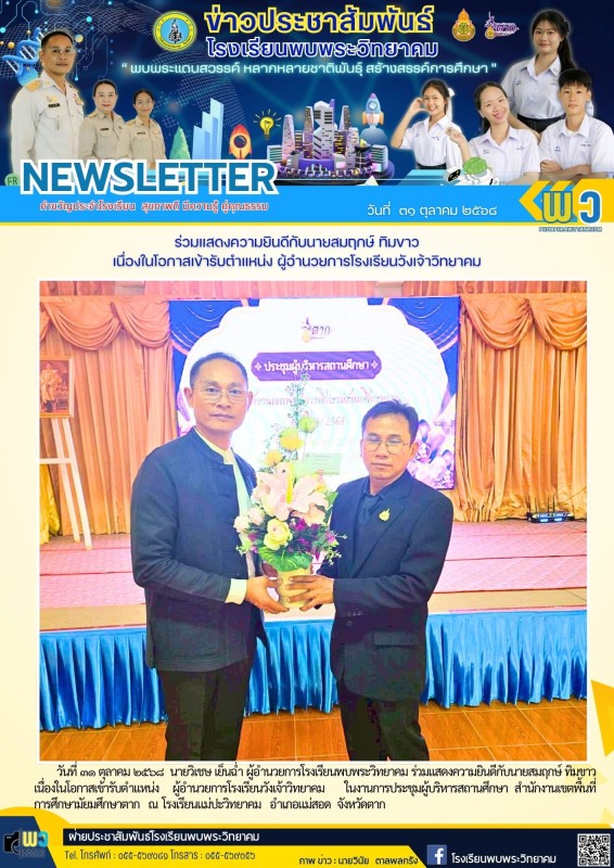 วันที่ ๓๑ ตุลาคม ๒๕๖๘ นายวิเชษ เย็นฉ่ำ ผู้อำนวยการโรงเรียนพบพระวิทยาคม ร่วมแสดงความยินดีกับนายสมฤกษ์ ทิมขาว เนื่องในโอกาสเข้ารับตำแหน่ง ผู้อำนวยการโรงเรียนวังเจ้าวิทยาคม ในงานการประชุมผู้บริหารสถานศึกษา สำนักงานเขตพื้นที่ การศึกษามัยมศึกษาตาก ณ โรงเรียนแม่ปะวิทยาคม อำเภอแม่สอด จังหวัดตาก |