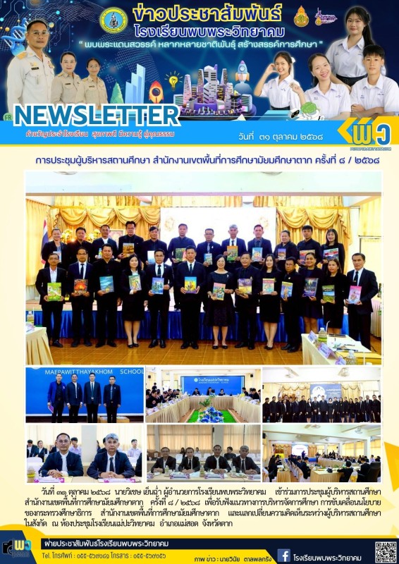 วันที่ ๓๑ ตุลาคม ๒๕๖๘ นายวิเชษ เย็นฉ่ำ ผู้อำนวยการโรงเรียนพบพระวิทยาคม เข้าร่วมการประชุมผู้บริหารสถานศึกษา สำนักงานเขตพื้นที่การศึกษามัยมศึกษาตาก ครั้งที่ ๘ / ๒๕๖๘ เพื่อรับฟังแนวทางการบริหารจัดการศึกษา การขับเคลื่อนนโยบายของกระทรวงศึกษาธิการ สำนักงานเขตพื้นที่การศึกษามัยมศึกษาตาก และแลกเปลี่ยนความคิดเห็นระหว่างผู้บริหารสถานศึกษาในสังกัด ณ ห้องประชุมโรงเรียนแม่ปะวิทยาคม อำเภอแม่สอด จังหวัดตาก |