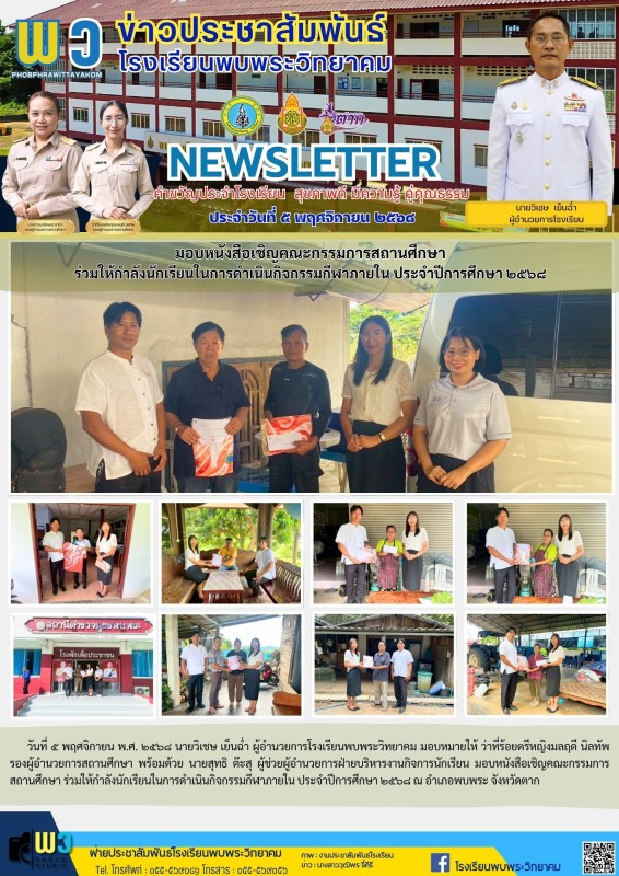 วันที่ ๕ พฤศจิกายน พ.ศ. ๒๕๖๘ นายวิเชษ เย็นฉ่ำ ผู้อำนวยการโรงเรียนพบพระวิทยาคม มอบหมายให้ ว่าที่ร้อยตรีหญิงมลฤดี นิลทัพ รองผู้อำนวยการสถานศึกษา พร้อมด้วย นายสุทธิ ต๊ะสุ ผู้ช่วยผู้อำนวยการฝ่ายบริหารงานกิจการนักเรียน มอบหนังสือเชิญคณะกรรมการสถานศึกษา ร่วมให้กำลังนักเรียนในการดำเนินกิจกรรมกีฬาภายใน ประจำปีการศึกษา ๒๕๖๘ ณ อำเภอพบพระ จังหวัดตาก |