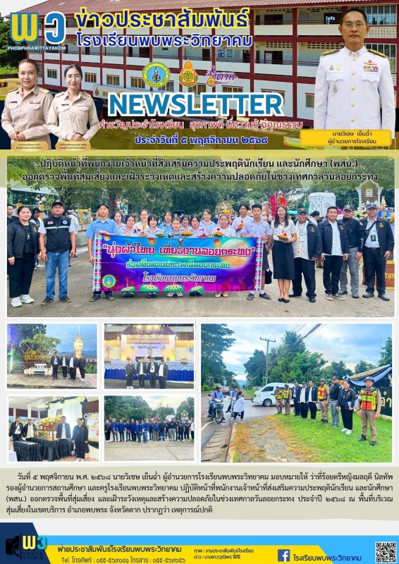 วันที่ ๕ พฤศจิกายน พ.ศ. ๒๕๖๘ นายวิเชษ เย็นฉ่ำ ผู้อำนวยการโรงเรียนพบพระวิทยาคม มอบหมายให้ ว่าที่ร้อยตรีหญิงมลฤดี นิลทัพ รองผู้อำนวยการสถานศึกษา และครูโรงเรียนพบพระวิทยาคม ปฏิบัติหน้าที่พนักงานเจ้าหน้าที่ส่งเสริมความประพฤตินักเรียน และนักศึกษา (พสน.) ออกตรวจพื้นที่สุ่มเสี่ยง และเฝ้าระวังเหตุและสร้างความปลอดภัยในช่วงเทศกาลวันลอยกระทง ประจำปี ๒๕๖๘ ณ พื้นที่บริเวณ สุ่มเสี่ยงในเขตบริการ อำเภอพบพระ จังหวัดตาก ปรากฏว่า เหตุการณ์ปกติ |