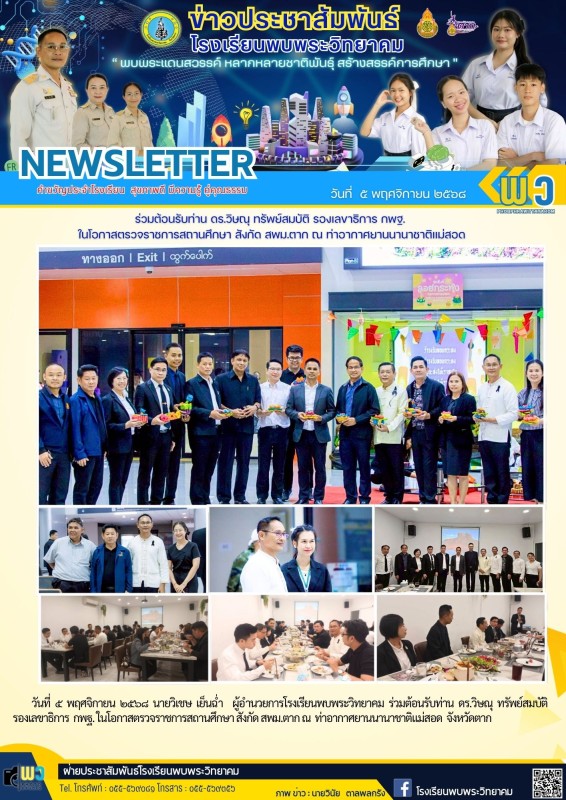 วันที่ ๕ พฤศจิกายน ๒๕๖๘ นายวิเชษ เย็นฉ่ำ ผู้อำนวยการโรงเรียนพบพระวิทยาคม ร่วมต้อนรับท่าน ดร.วิษณุ ทรัพย์สมบัติ รองเลขาธิการ กพฐ. ในโอกาสตรวจราชการสถานศึกษา สังกัด สพม.ตาก ณ ท่าอากาศยานนานาชาติแม่สอด จังหวัดตาก |