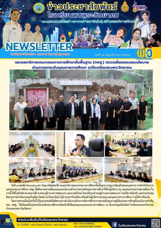 โดยการตรวจเยี่ยมในครั้งนี้ มีวัตถุประสงค์เพื่อติดตามการดำเนินงานด้านการจัดการศึกษาการยกระดับคุณภาพผู้เรียน และการขับเคลื่อนนโยบายสำคัญของ สพฐ. ให้เกิดผลเป็นรูปธรรมในระดับสถานศึกษา พร้อมรับฟังข้อเสนอแนะและแนวทางการพัฒนา ณ ห้องประชุมเกียรติยศ โรงเรียนพบพระวิทยาคม อำเภอพบพระ จังหวัดตาก |