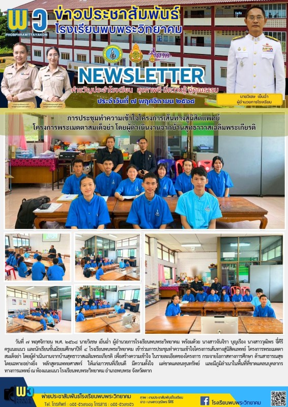 วันที่ ๗ พฤศจิกายน พ.ศ. ๒๕๖๘ นายวิเชษ เย็นฉ่ำ ผู้อำนวยการโรงเรียนพบพระวิทยาคม พร้อมด้วย นางสาวจันจิรา บุญเรือง นางสาววุฒิพร จี๋คีรี ครูแนะแนว และนักเรียนชั้นมัธยมศึกษาปีที่ ๔ โรงเรียนพบพระวิทยาคม เข้าร่วมการประชุมทำความเข้าใจโครงการเส้นทางสู่นิสิตแพทย์ โครงการพระเมตตาสมเด็จย่า โดยผู้ดำเนินงานจากบ้านสุทธาวาสเฉลิมพระเกียรติ เพื่อสร้างความเข้าใจ ในรายละเอียดของโครงการ กระจายโอกาสทางการศึกษา ด้านสาธารณสุข โดยเฉพาะอย่างยิ่ง หลักสูตรแพทยศาสตร์ ให้แก่เยาวชนที่เรียนดี มีความตั้งใจ แต่ขาดแคลนทุนทรัพย์ และมีภูมิลำเนาในพื้นที่ที่ขาดแคลนบุคลากรทางการแพทย์ ณ ห้องแนะแนว โรงเรียนพบพระวิทยาคม อำเภอพบพระ จังหวัดตาก |