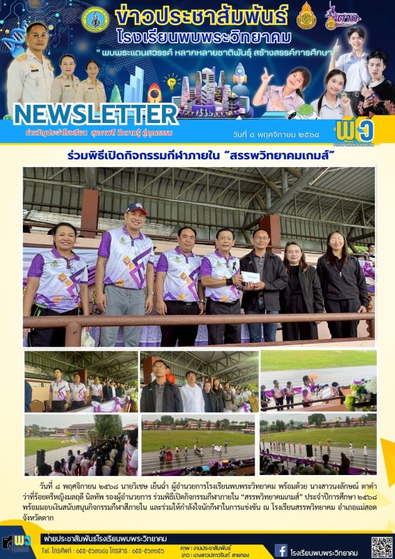 วันที่ ๘ พฤศจิกายน ๒๕๖๘ นายวิเชษ เย็นฉ่ำ ผู้อำนวยการโรงเรียนพบพระวิทยาคม พร้อมด้วย นางสาวนงลักษณ์ ตาคำ ว่าที่ร้อยตรีหญิงมลฤดี นิลทัพ รองผู้อำนวยการ ร่วมพิธีเปิดกิจกรรมกีฬาภายใน “สรรพวิทยาคมเกมส์” ประจำปีการศึกษา ๒๕๖๘ พร้อมมอบเงินสนับสนุนกิจกรรมกีฬาสีภายใน และร่วมให้กำลังใจนักกีฬาในการแข่งขัน ณ โรงเรียนสรรพวิทยาคม อำเภอแม่สอด จังหวัดตาก |