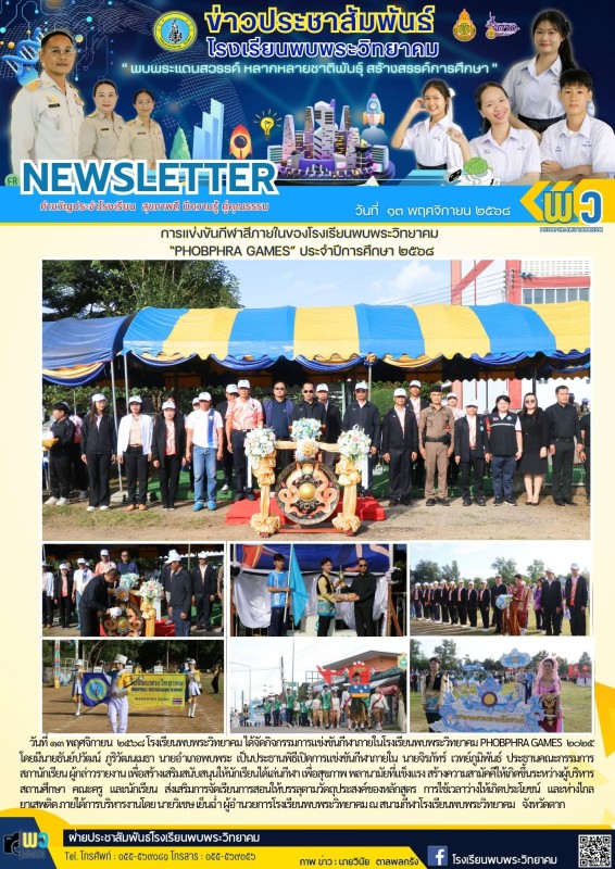 วันที่ ๑๓ พฤศจิกายน ๒๕๖๘ โรงเรียนพบพระวิทยาคม ได้จัดกิจกรรมการแข่งขันกีฬาภายในโรงเรียนพบพระวิทยาคม PHOBPHRA GAMES ๒๐๒๕ โดยมีนายธันย์ปวัฒน์ ภูริวัฒนเมธา นายอำเภอพบพระ เป็นประธานพิธีเปิดการแข่งขันกีฬาภายใน นายจิรภัทร์ เวทย์ภูมิพันธ์ ประธานคณะกรรมการสภานักเรียน ผู้กล่าวรายงาน เพื่อสร้างเสริมสนับสนุนให้นักเรียนได้เล่นกีฬา เพื่อสุขภาพ พลานามัยที่แข็งแรง สร้างความสามัคคีให้เกิดขึ้นระหว่างผู้บริหารสถานศึกษา คณะครู และนักเรียน ส่งเสริมการจัดเรียนการสอนให้บรรลุตามวัตถุประสงค์ของหลักสูตร การใช้เวลาว่างให้เกิดประโยชน์ และห่างไกลยาเสพติด ภายใต้การบริหารงานโดย นายวิเชษ เย็นฉ่ำ ผู้อำนวยการโรงเรียนพบพระวิทยาคม ณ สนามกีฬาโรงเรียนพบพระวิทยาคม จังหวัดตาก |
