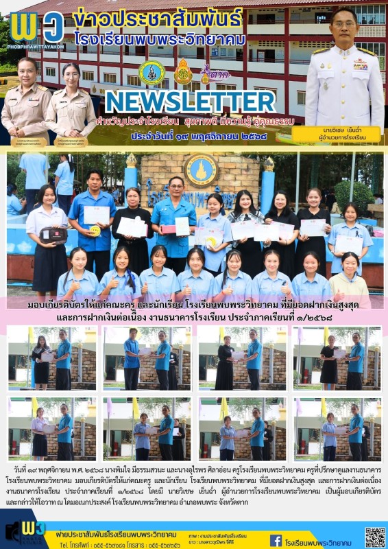 วันที่ ๑๙ พฤศจิกายน พ.ศ. ๒๕๖๘ นางพิมใจ มีธรรมสวนะ และนางอุไรพร ศิลาอ่อน ครูโรงเรียนพบพระวิทยาคม ครูที่ปรึกษาดูแลงานธนาคารโรงเรียนพบพระวิทยาคม มอบเกียรติบัตรให้แก่คณะครู และนักเรียน โรงเรียนพบพระวิทยาคม ที่มียอดฝากเงินสูงสุด และการฝากเงินต่อเนื่อง งานธนาคารโรงเรียน ประจำภาคเรียนที่ ๑/๒๕๖๘ โดยมี นายวิเชษ เย็นฉ่ำ ผู้อำนวยการโรงเรียนพบพระวิทยาคม เป็นผู้มอบเกียรติบัตร และกล่าวให้โอวาท ณ โดมอเนกประสงค์ โรงเรียนพบพระวิทยาคม อำเภอพบพระ จังหวัดตาก |