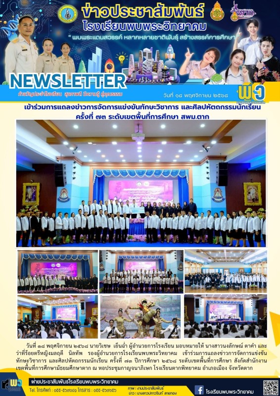 วันที่ ๑๘ พฤศจิกายน ๒๕๖๘ นายวิเชษ เย็นฉ่ำ ผู้อำนวยการโรงเรียน มอบหมายให้ นางสาวนงลักษณ์ ตาคำ และว่าที่ร้อยตรีหญิงมลฤดี นิลทัพ รองผู้อำนวยการโรงเรียนพบพระวิทยาคม เข้าร่วมการแถลงข่าวการจัดการแข่งขันทักษะวิชาการ และศิลปหัตถกรรมนักเรียน ครั้งที่ ๗๓ ปีการศึกษา ๒๕๖๘ ระดับเขตพื้นที่การศึกษา สังกัดสำนักงานเขตพื้นที่การศึกษามัธยมศึกษาตาก ณ หอประชุมกาญจนาภิเษก โรงเรียนตากพิทยาคม อำเภอเมือง จังหวัดตาก |