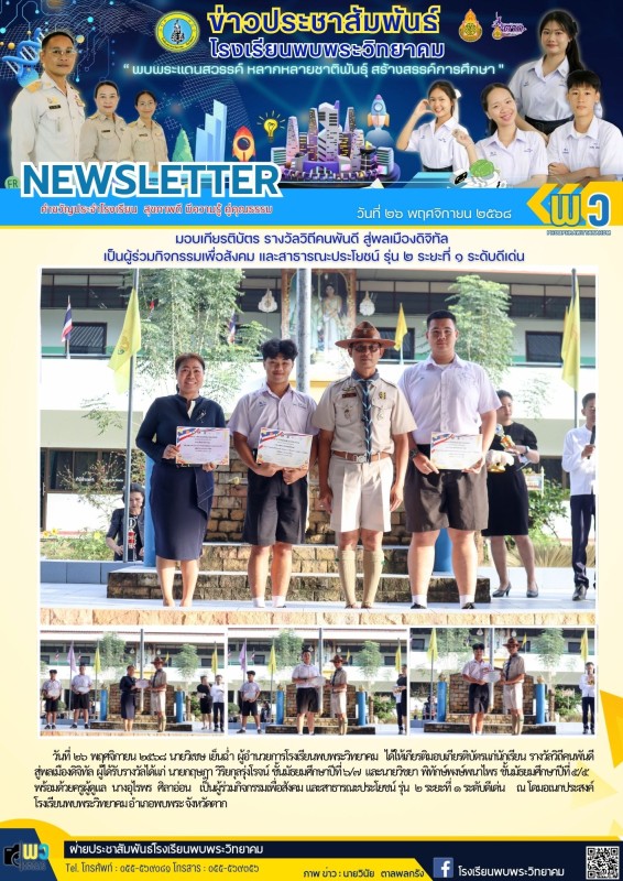 วันที่ ๒๖ พฤศจิกายน ๒๕๖๘ นายวิเชษ เย็นฉ่ำ ผู้อำนวยการโรงเรียนพบพระวิทยาคม ได้ให้เกียรติมอบเกียรติบัตรแก่นักเรียน รางวัลวิถีคนพันดี สู่พลเมืองดิจิทัล ผู้ได้รับรางวัลได้แก่ นายกฤษฎา วิริยกุลรุ่งโรจน์ ชั้นมัธยมศึกษาปีที่ ๖/๗ และนายวิชยา พิทักษ์พงษ์พนาไพร ชั้นมัธยมศึกษาปีที่ ๕/๕พร้อมด้วยครูผู้ดูแล นางอุไรพร ศิลาอ่อน เป็นผู้ร่วมกิจกรรมเพื่อสังคม และสาธารณะประโยชน์ รุ่น ๒ ระยะที่ ๑ ระดับดีเด่น ณ โดมอเนกประสงค์ โรงเรียนพบพระวิทยาคม อำเภอพบพระ จังหวัดตาก |