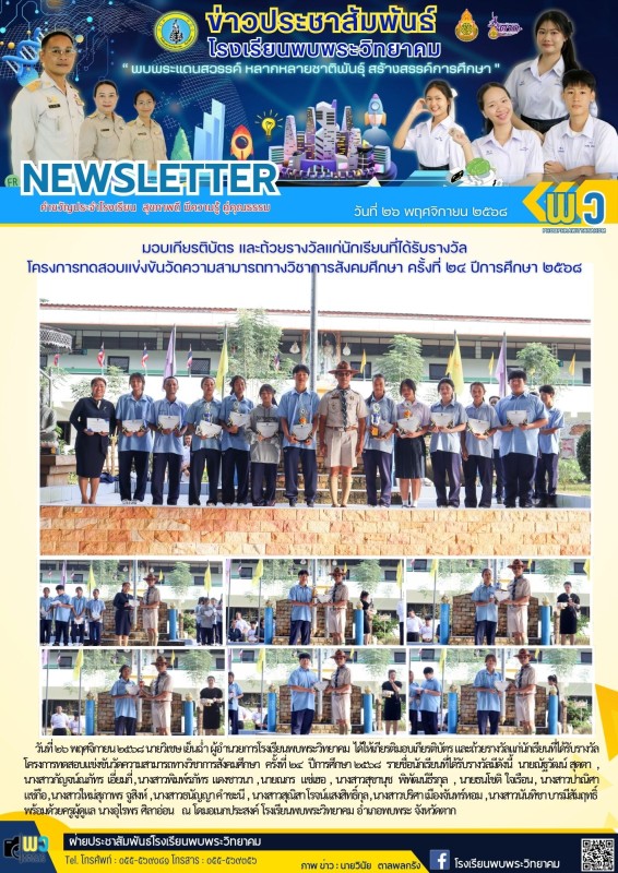 วันที่ ๒๖ พฤศจิกายน ๒๕๖๘ นายวิเชษ เย็นฉ่ำ ผู้อำนวยการโรงเรียนพบพระวิทยาคม ได้ให้เกียรติมอบเกียรติบัตร และถ้วยรางวัลแก่นักเรียนที่ได้รับรางวัล โครงการทดสอบแข่งขันวัดความสามารถทางวิชาการสังคมศึกษา ครั้งที่ ๒๔ ปีการศึกษา ๒๕๖๘ รายชื่อนักเรียนที่ได้รับรางวัลมีดังนี้