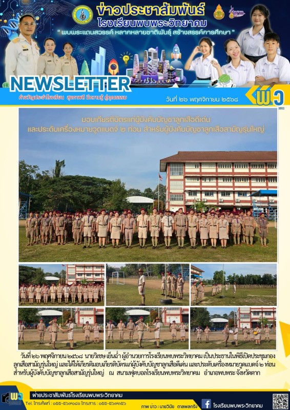 วันที่ ๒๖ พฤศจิกายน ๒๕๖๘ นายวิเชษ เย็นฉ่ำ ผู้อำนวยการโรงเรียนพบพระวิทยาคม เป็นประธานในพิธีเปิดประชุมกอง ลูกเสือสามัญรุ่นใหญ่ และได้ให้เกียรติมอบเกียรติบัตรแก่ผู้บังคับบัญชาลูกเสือดีเด่น และประดับเครื่องหมายวูดแบดจ์ ๒ ท่อน สำหรับผู้บังคับบัญชาลูกเสือสามัญรุ่นใหญ่ ณ สนามฟุตบอลโรงเรียนพบพระวิทยาคม อำเภอพบพระ จังหวัดตาก |