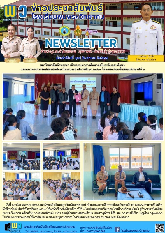 วันที่ ๑๗ ธันวาคม พ.ศ. ๒๕๖๘ มหาวิทยาลัยเจ้าพระยา จังหวัดนครสวรรค์ เข้าแนะแนวการศึกษาต่อในระดับอุดมศึกษา และแนวทางการรับสมัครนักศึกษาใหม่ ประจำปีการศึกษา ๒๕๖๙ ให้แก่นักเรียนชั้นมัธยมศึกษาปีที่ ๖ โรงเรียนพบพระวิทยาคม โดยมี นายวิเชษ เย็นฉ่ำ ผู้อำนวยการโรงเรียนพบพระวิทยาคม พร้อมด้วย นางสาวนงลักษณ์ ตาคำ รองผู้อำนวยการสถานศึกษา นางสาววุฒิพร จี๋คีรี และ นางสาวจันจิรา บุญเรือง ครูแนะแนว โรงเรียนพบพระวิทยาคม ให้การต้อนรับ ณ ห้องประชุมกาสะลอง โรงเรียนพบพระวิทยาคม อำเภอพบพระ จังหวัดตาก |